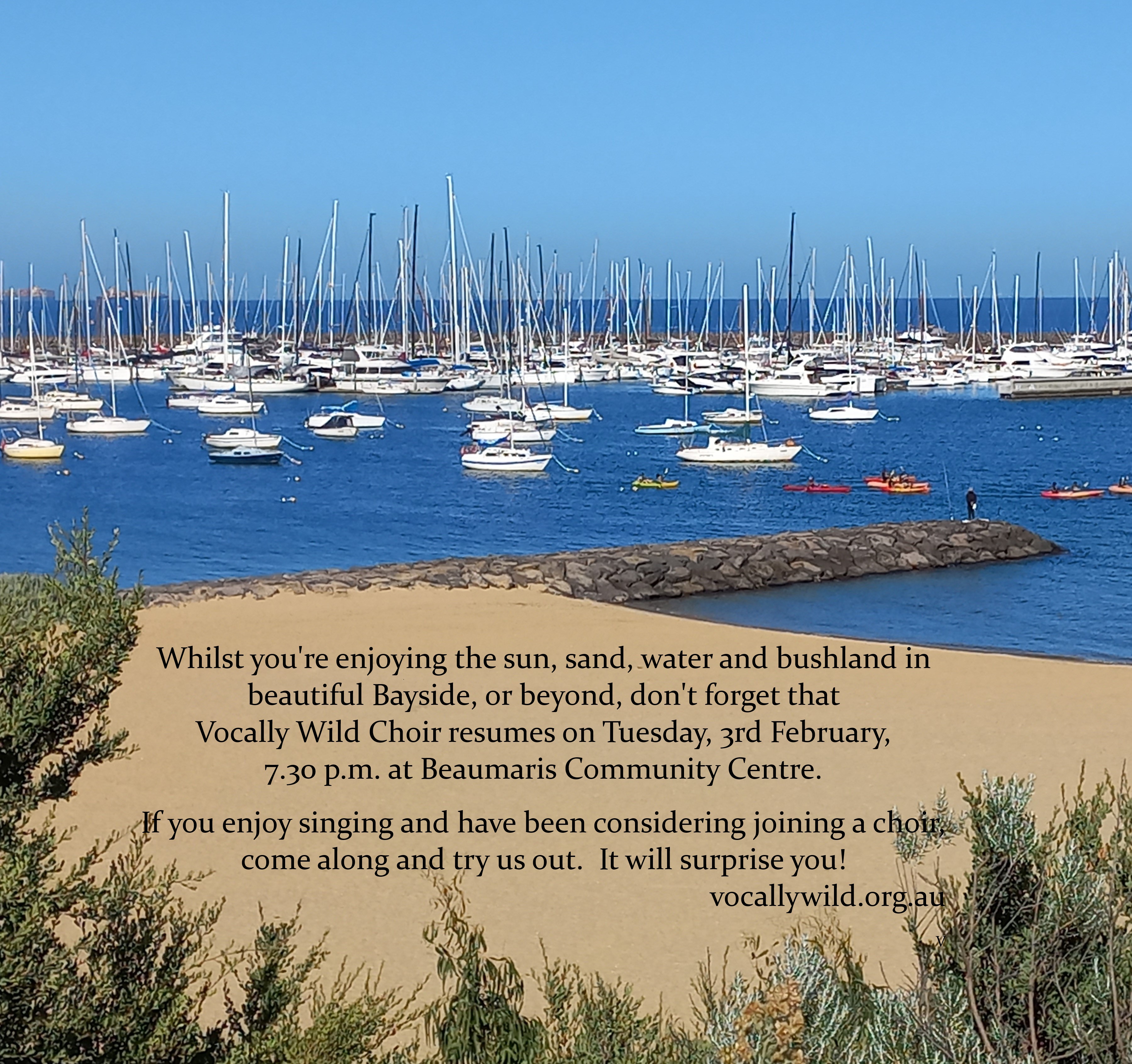 Term 4 is an ideal time to consider joining the choir because we are learning our new songs for 2026, so you can start at the very beginning. We provide new members with copies of all music and access to the piano recordings of all parts. We also have experienced buddies available in each section to help you settle in. And the best bit is you get the chance to perform in our Christmas concerts, including the iconic Bayside Carols with fireworks and a crowd over 20,000 (Tuesday 9 Dec), and our own Vocally Wild Community Carols concert and singalong at the Beaumaris Hall (Sunday 21 Dec).
